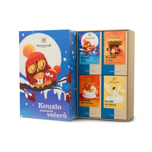 Zimná noc bio (ochutený ovocný čaj) – šípkový bio, ibištek bio, pomarančová kôra bio, škorica bio, jablká bio, klinček bio, esenciálne oleje bio (pomaranč bio, mandarínka bio, klinček bio, škorica bio, levanduľa bio);